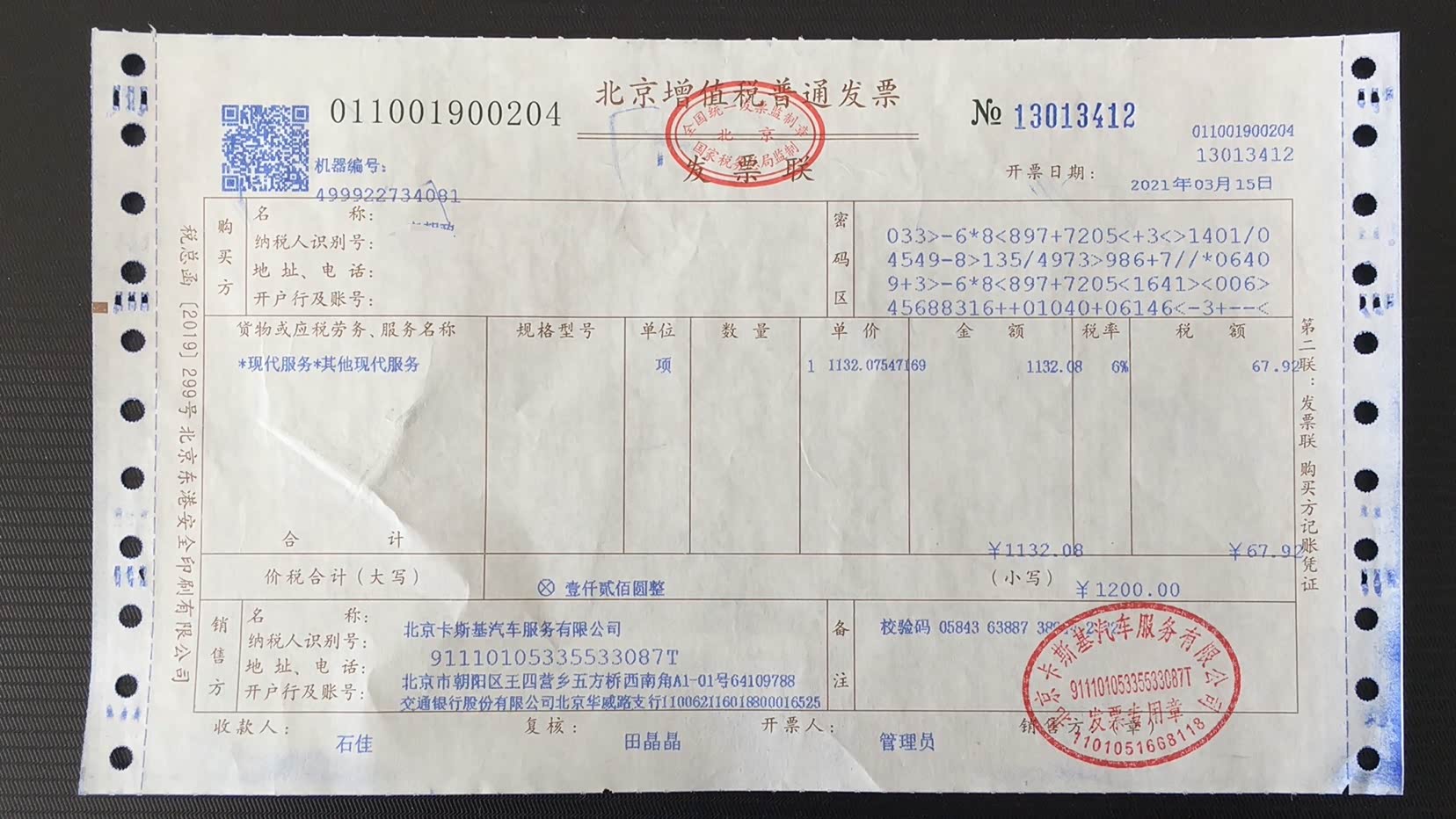 但在2月8日完成费用支付后,发票却迟迟不见踪影,在自己几次催促的情况下,第三方公司才把发票寄了过来。“3月20日我收到发票,显示的开票日期是3月15日,而且服务项目根本也不是什么提档外迁或者过户之类的,是现代服务。”