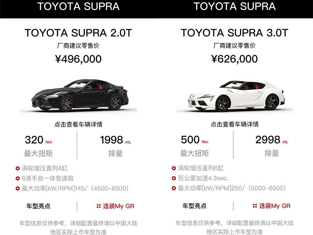 4月2日丰田官方宣布,旗下全新SUPRA正式上市,共推出2款车型,售价分别为49.60万元和62.60万元。