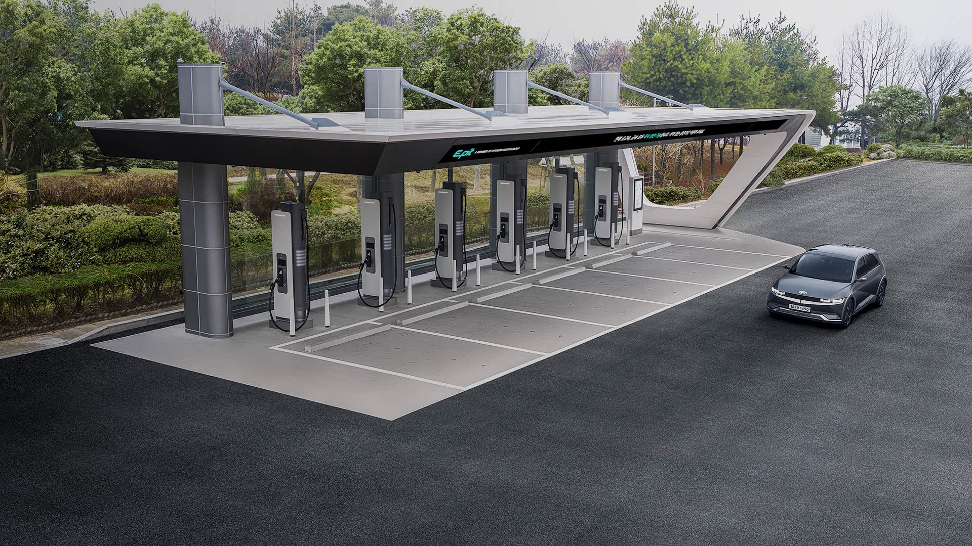 韩国现代汽车为电动车设计了一款快速充电站的样板,该充电站被命名为E-Pit,其整体造型与当下的加油站类似。
