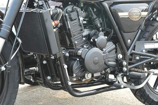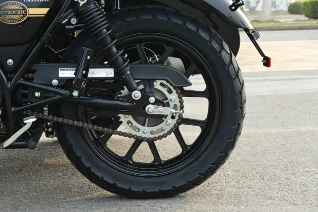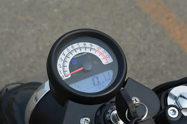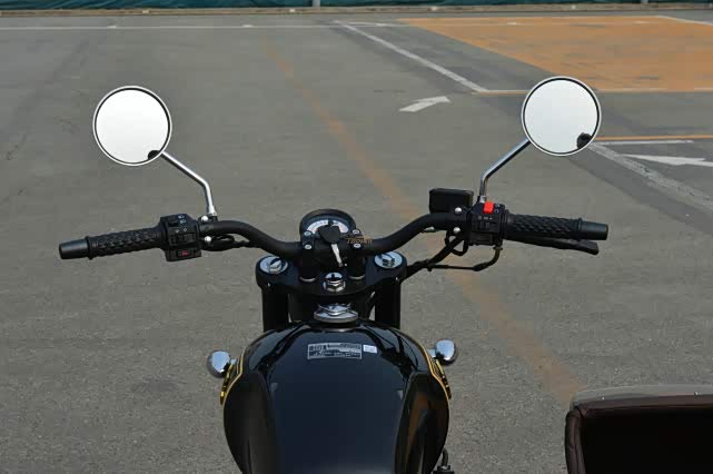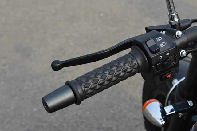 圆形的镀铬后视镜很有味道,常规的手把骑行姿势舒适,坐姿自然直立,腿部空间充裕,即便是身高180cm的骑士,也不会觉得腿部舒展不开。
