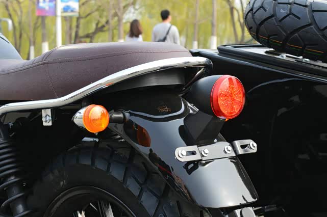 全车圆形卤素灯,将复古风进行到底,不仅是圆形的头灯和尾灯,包括前后转向灯,边斗转向灯,也都是经典的卤素灯造型。