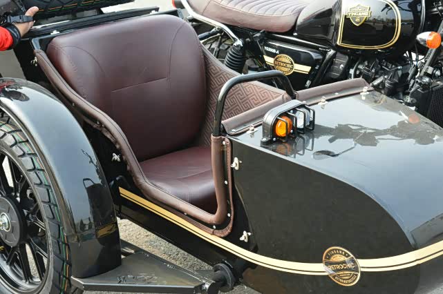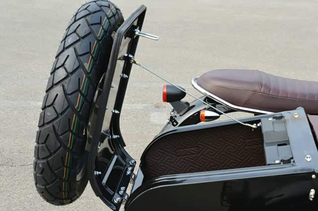 短尾在边三轮上同样适用,咖啡色的皮革坐垫颇有档次,厂家也贴心的设计了后座扶手,不过对于边三轮而言,后座其实是次要的,边斗才是最舒服的。