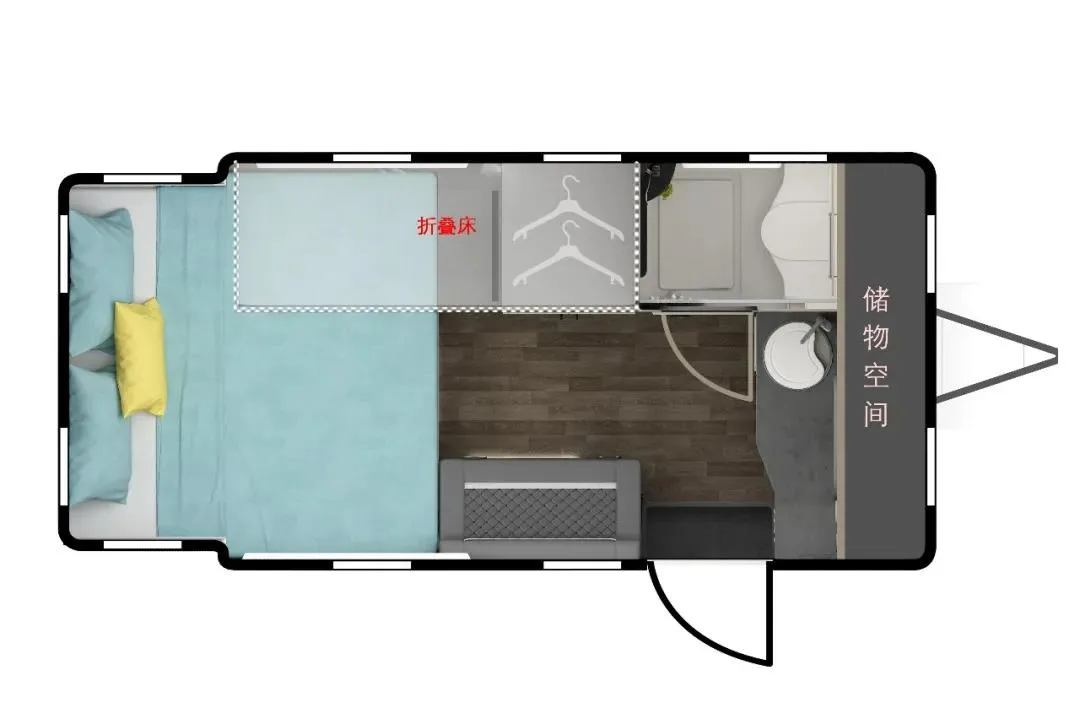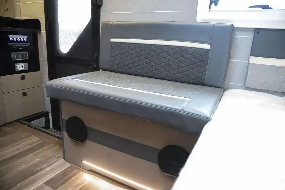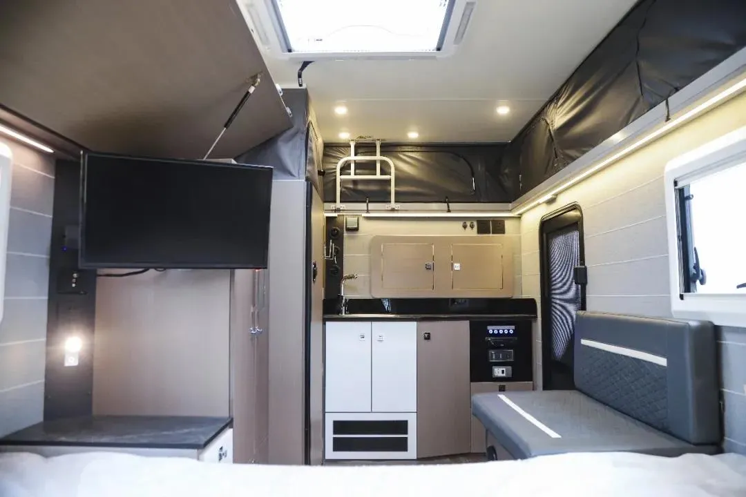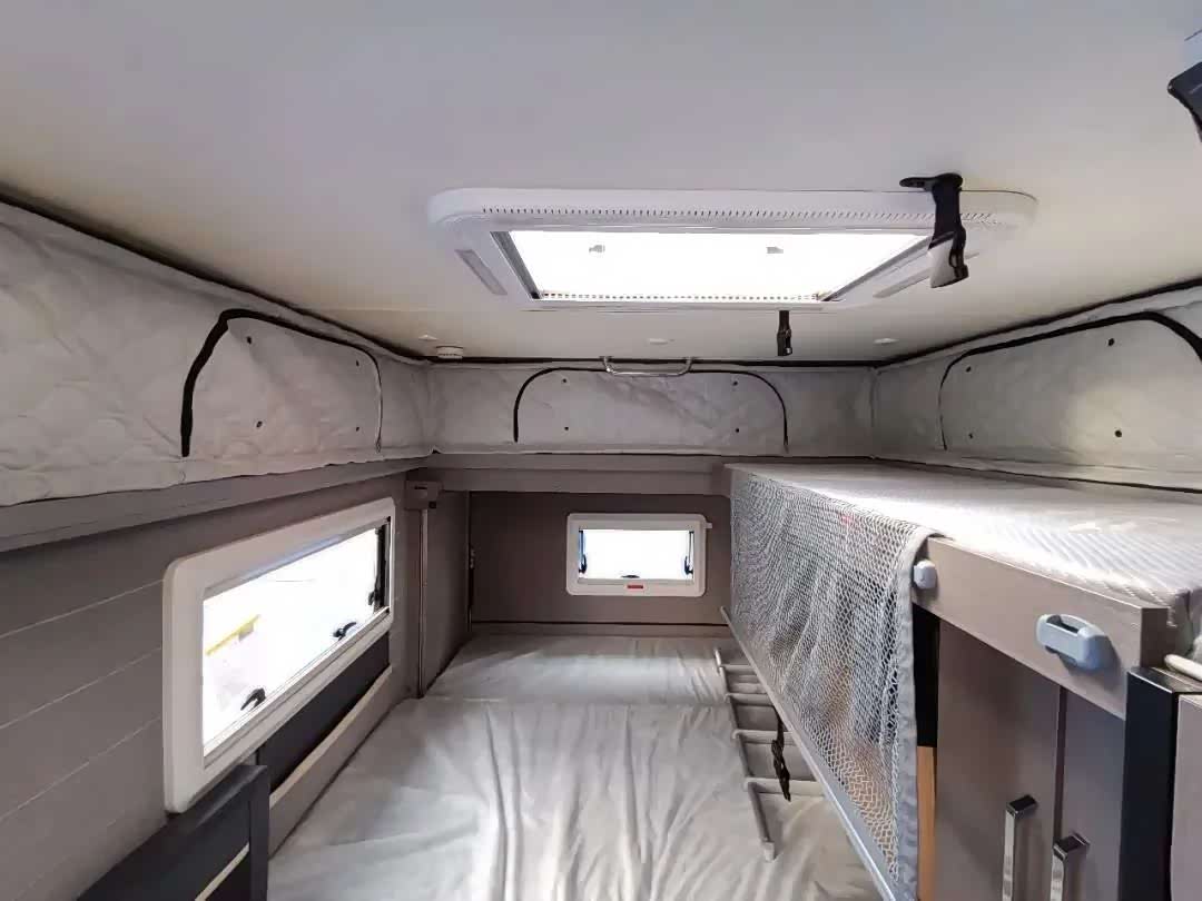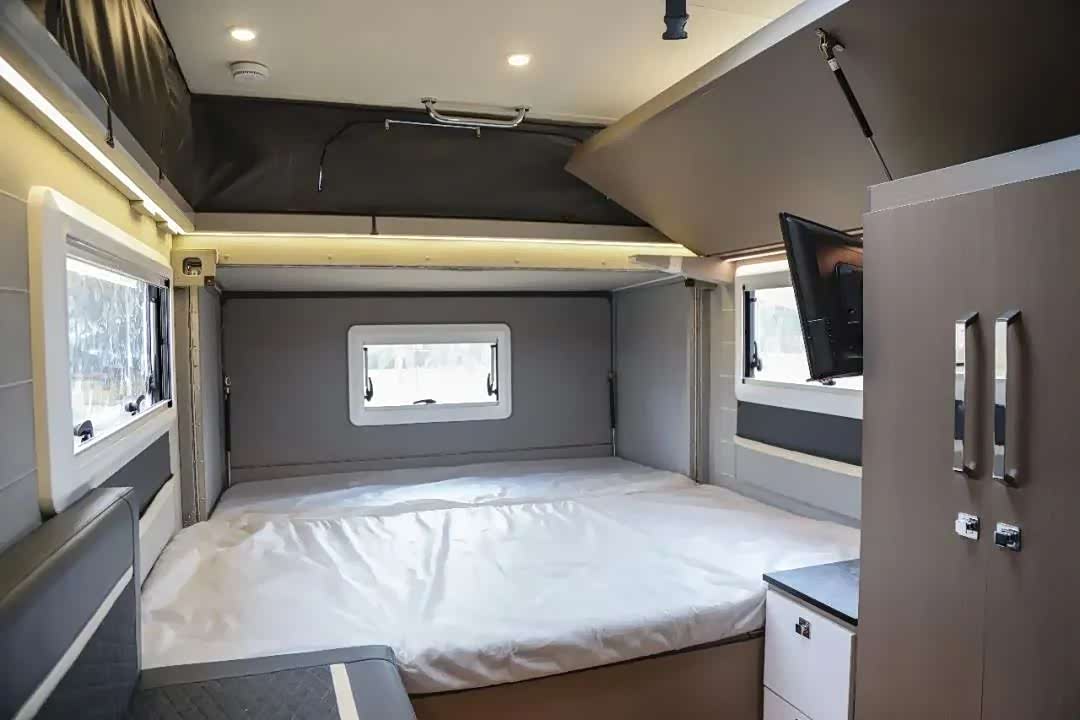 T520可满足3-4人居住使用,首先是车尾拓展后的双人尺寸的大床;此外,由于车辆的升顶设计,T520充分利用了这部分空间,在车身一侧的顶部设计有一张折叠床。厨卫区域前置,中间则是车辆的会客区域。