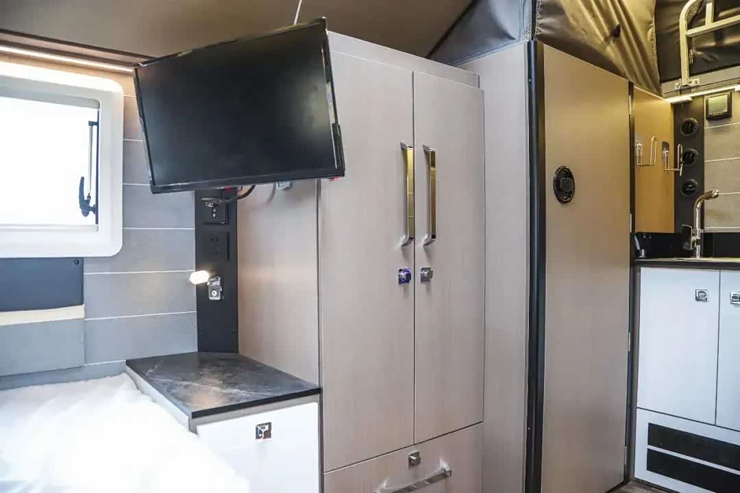 尾部拓展仓打开后,可增加1800*800mm的空间,让车尾的双人床尺寸达到2000*1800mm,此处可根据需要选配单人床。车辆配置有2400W的底置冷暖空调以及柴油暖风一体机;车箱加棉篷布、隔热箱体,可使车内时刻拥有适宜的温度。