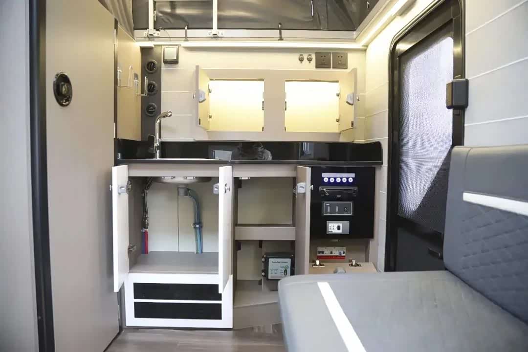 车内的厨房区域配置十分齐全,洗菜池、电磁炉、微波炉、一款冷冻保鲜双区55L冰箱、多个大尺寸的储物柜,再搭配户外厨房部分,民以食为天,在外游玩也不能在吃的方面亏待自己。车内电力配置方面,携带有200Ah铅酸蓄电池、380W太阳能板和一台3kW充逆变一体机。