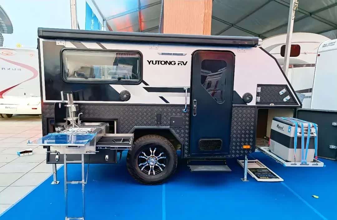 小巧的尺寸带来的是车辆行驶过程的稳定性,轻量化的车身,拖挂自重为1.5吨;车前使用澳洲进口万向牵引器,可四向调节角度,崎岖的路面也不影响后车的稳定;底盘采用双减震螺旋簧独立悬架+700QSTE高强度钢车架,车身为铝骨架层压板箱体组合。