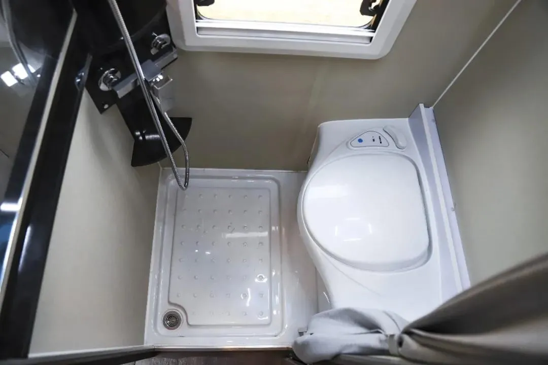 独立卫生间采用干湿一体的设计,内部配置有抽拉式马桶、淋浴花洒、8L燃气热水器、梳妆镜、换气扇等设施。水路系统方面,整车配备了140L净水箱+80L灰水箱。