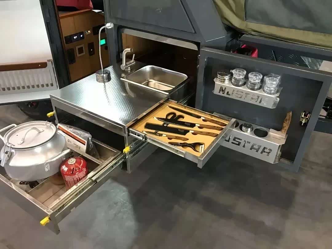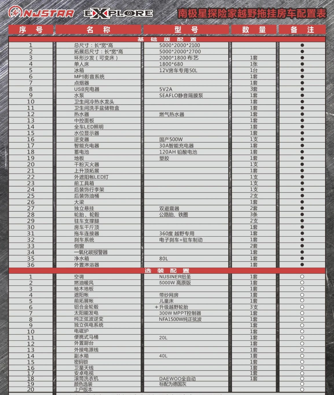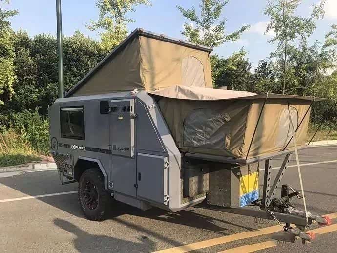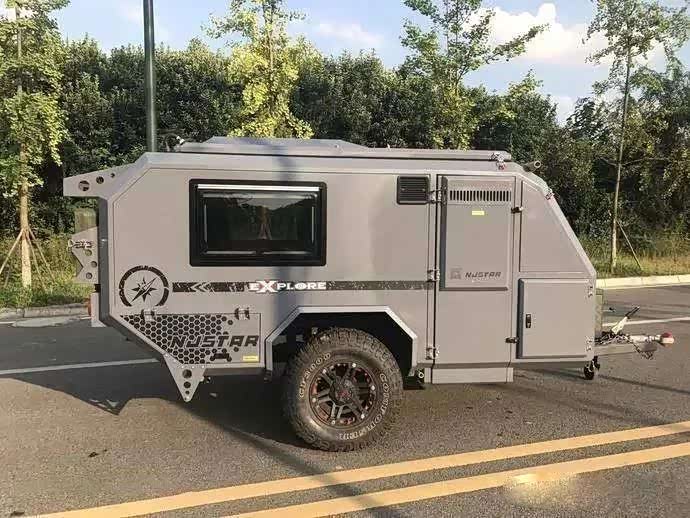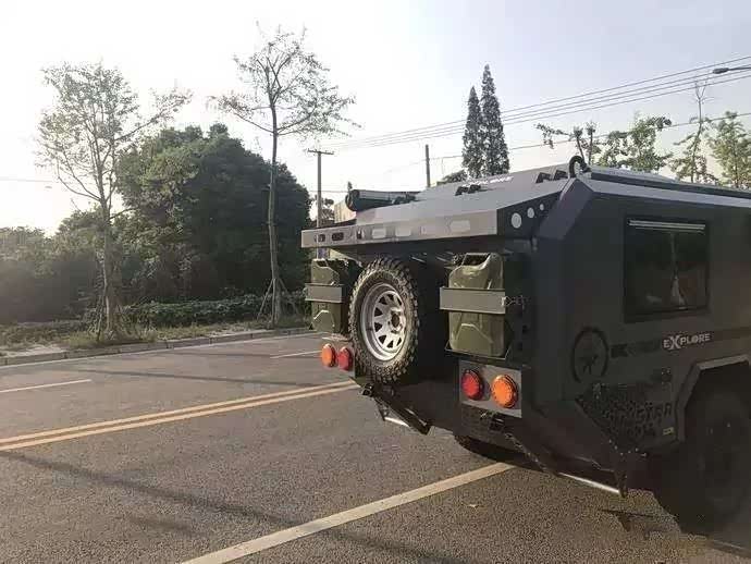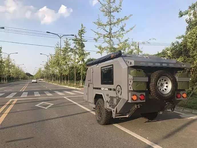 外观上,南极星探险家越野拖挂就有着浓浓的硬派越野风,整车采用了航空铝质车身,德国灰涂装低调耐脏,整车质量为900kg,排量2.0L以上的车即可牵引,高强度轻量化的车身是它的一大亮点。