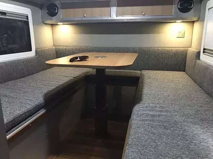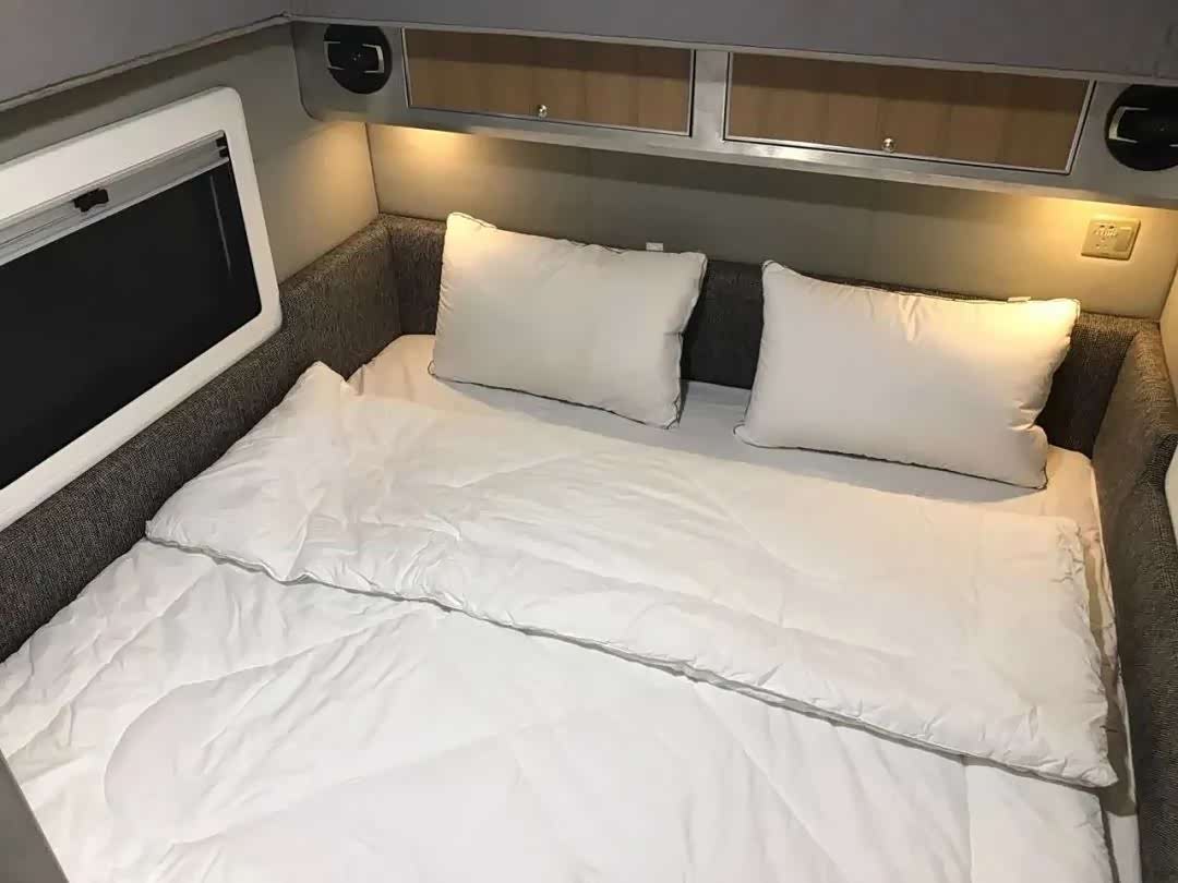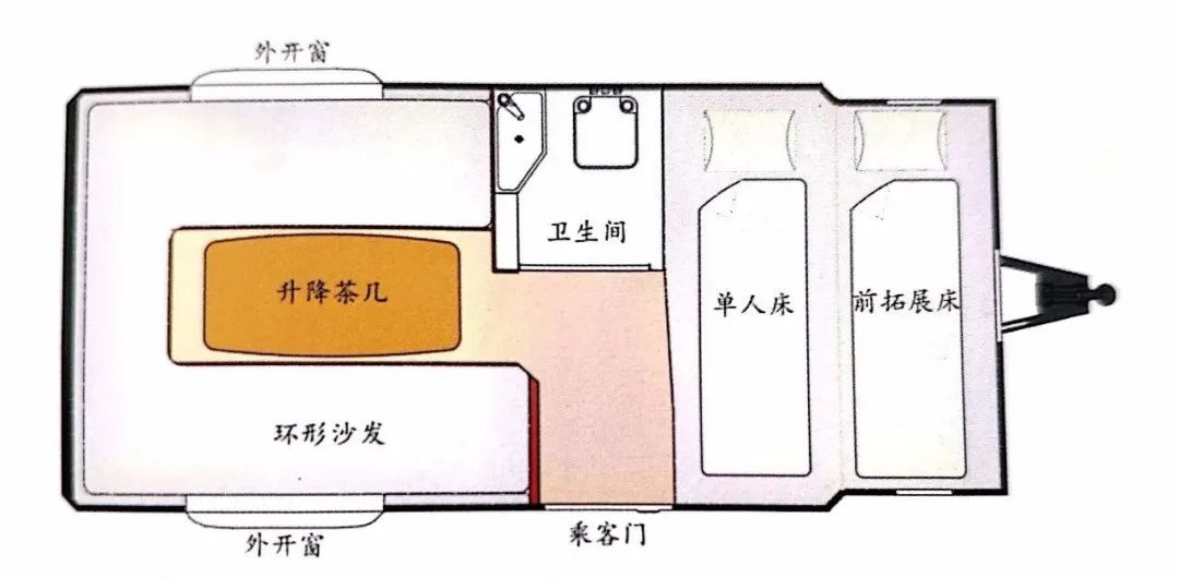 内部采用了E0级别的环保材料和来自缅甸的天然柚木地板,安全健康环保,从前到后的布局依次为前拓展床、单人床、卫生间、会客区。