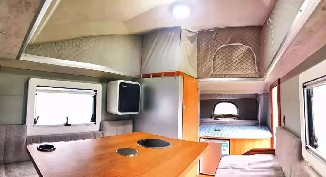 另一个休息区位于车前部,将扩展帐展开后,可形成1800*680(mm)的床铺,配合拓展床空间更大,床下配置有一台50L的交直流两用电冰箱。