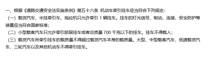 有些车友可能会担心总质量超过700kg,上路会受限制,《中华人民共和国道路交通安全法实施条例》第56条有所规定:小型载客汽车只允许牵引旅居挂车或总质量700千克以下的挂车。“或”字说明旅居牵引挂车不受700千克限制。