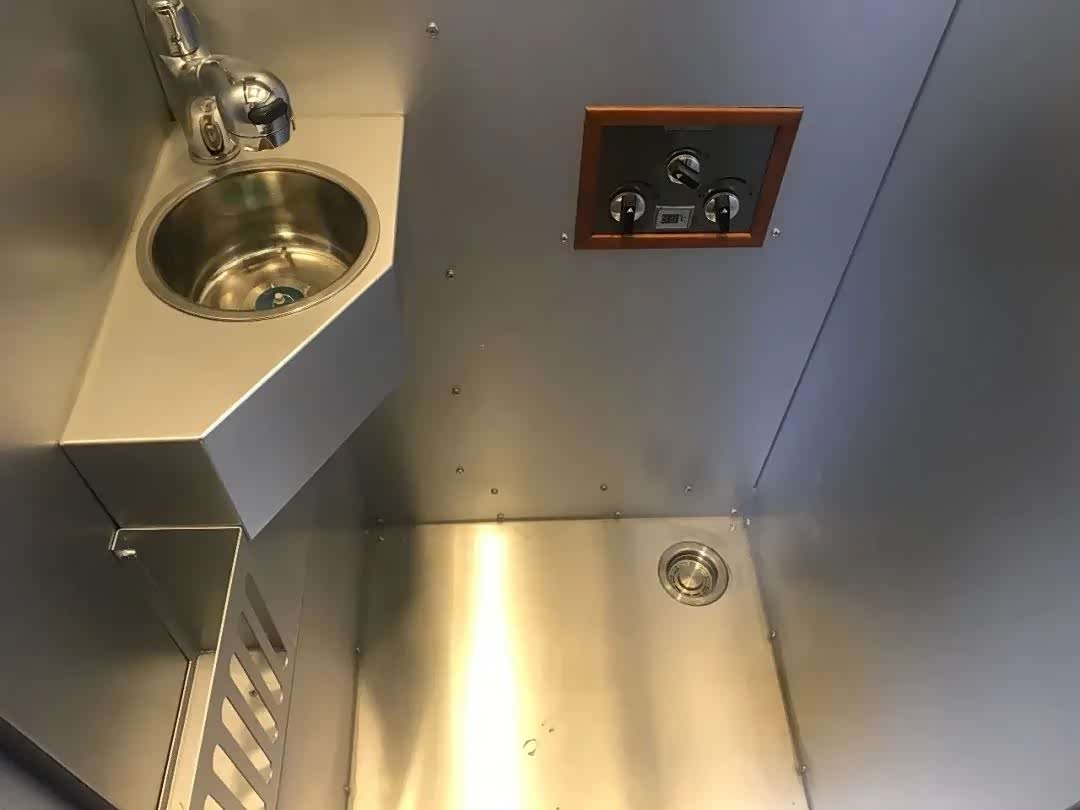 全铝结构卫浴间,更加结实耐用,内部配置有洗手池、抽拉式水龙头、便携式马桶。水路方面,整车配置有80L的净水箱。