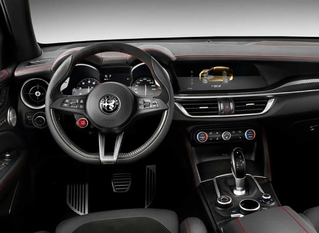 内饰方面则没有外观那么张扬,整体采用了T字型的布局,层次分明,但仔细观察会发现车内有质感不错的换挡拨片、放置在方向盘左下方的点火按键、炮筒式的仪表,绝对是驾驶者之车无疑了。车身尺寸方面,Stelvio 长宽高为4686/1903/1693mm,轴距达到了2818mm。