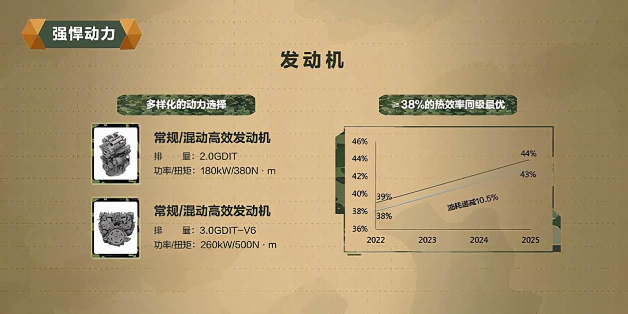 在动力方面,坦克平台涵盖ICE、PHEV、HEV三种动力形式。发动机除了现有的2.0T动力外,后续还推出3.0GDIT+ 9AT P2的动力组合,其系统总功率为380kW,峰值扭矩可达750N·m,为坦克平台的极致越野提供了强劲的动力保障。