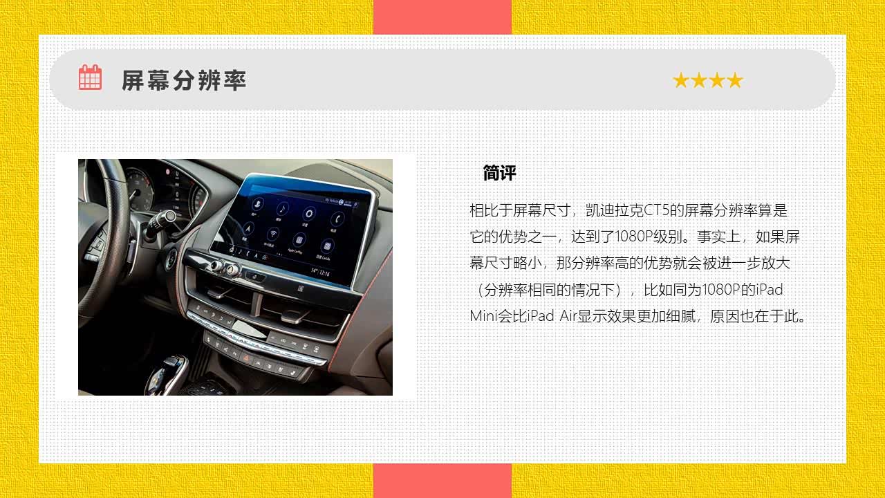 相比于屏幕尺寸,凯迪拉克CT5的屏幕分辨率算是它的优势之一,达到了1080P级别。事实上,如果屏幕尺寸略小,那分辨率高的优势就会被进一步放大(分辨率相同的情况下),比如同为1080P的iPad Mini会比iPadAir显示效果更加细腻,原因也在于此。