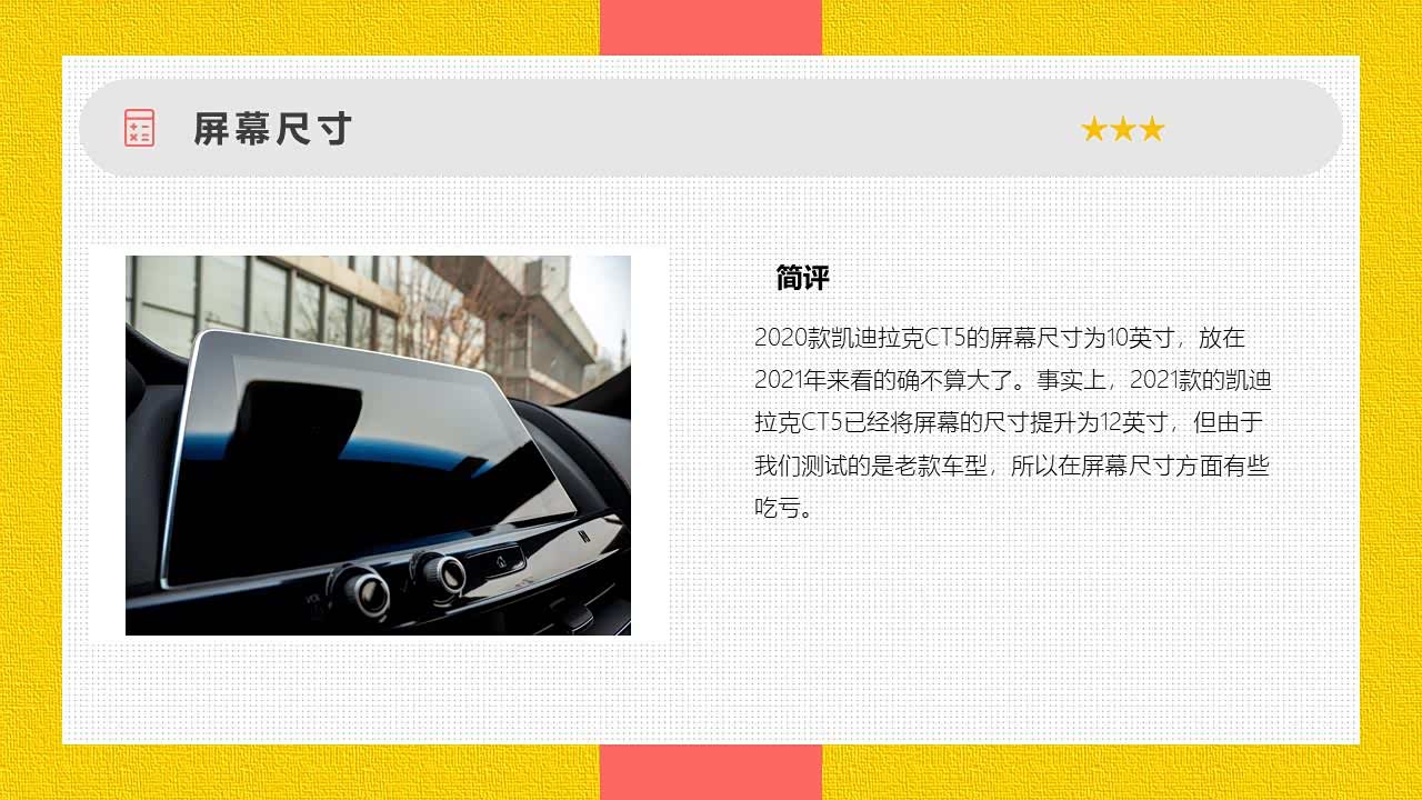 2020款凯迪拉克CT5的屏幕尺寸为10英寸,放在2021年来看的确不算大了。事实上,2021款的凯迪拉克CT5已经将屏幕的尺寸提升为12英寸,但由于我们测试的是老款车型,所以在屏幕尺寸方面有些吃亏。
