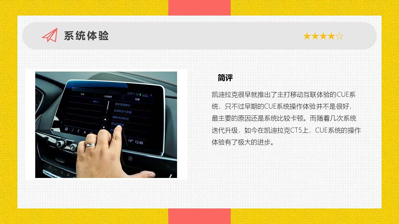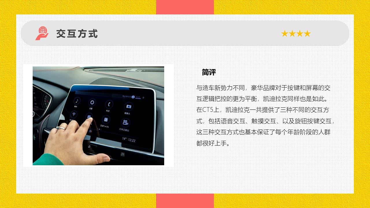 最后这一项,说一点我个人的想法。凯迪拉克CT5作为一款主打运动性的轿车,其实我原本没有对它的中控系统抱有太多期望,但最终的效果却有点令人惊喜。这辆车在中控系统上的绝大部分优缺点刚才我们都说过了,再说一些很细节的点(有好有坏):