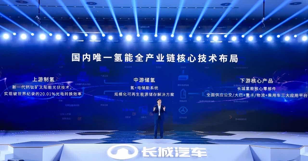 在产业链上游,长城汽车通过全球领先的20.01%光电转换效率的新一代钙钛矿太阳能光伏技术进行制氢,从而将光伏发电、电化学储能、氢气储运、动力电池梯次利用、热电联供等一系列能源相关产业结合起来,为规模化可再生能源存储以及未来的分布式能源社会提供解决方案。