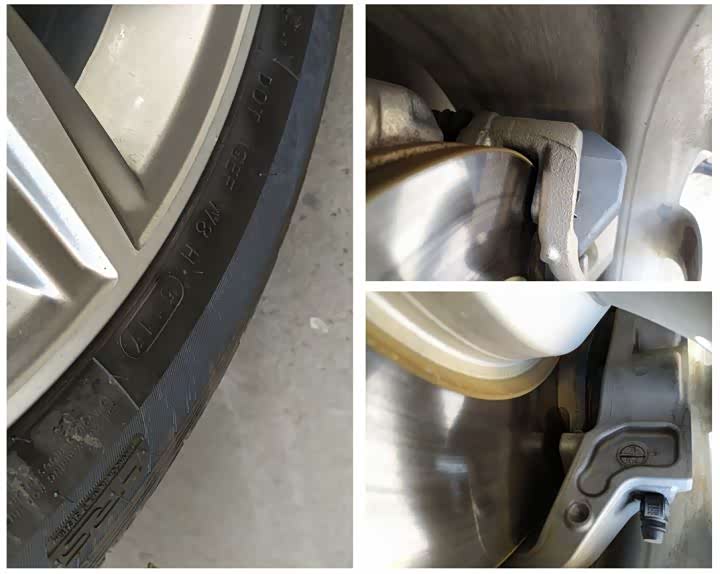 刹车片刹车盘磨损不大,轮胎也未见老化胎壁剐蹭等情况,均能正常使用,这个车况是非常不错了,整体表现和表显里程是对得上号的。