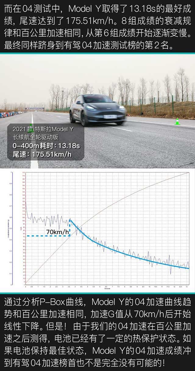 根据有驾评测体系,特斯拉Model Y的0-100km/h加速测试取得了满分。2、0-400m加速测试