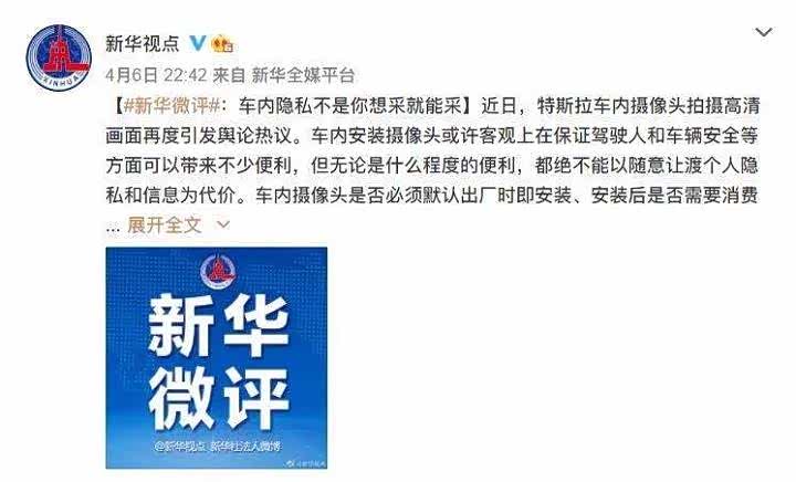 新华社评论昨日指出,“车内安装摄像头或许客观上在保证驾驶人和车辆安全等方面可以带来不少便利,但无论是什么程度的便利,都绝不能以随意让渡个人隐私和信息为代价。车内摄像头是否必须默认出厂时即安装、安装后是否需要消费者签订同意书才能启用,启用时是否可以一次授权而不是长期授权,这些都需要企业说清楚。”新华社还指出,“特斯拉应该明白,车内涉及到的隐私不是你想采就能采!”言下之意,特斯拉涉嫌侵犯用户隐私,应有一个说得通的解释才行。