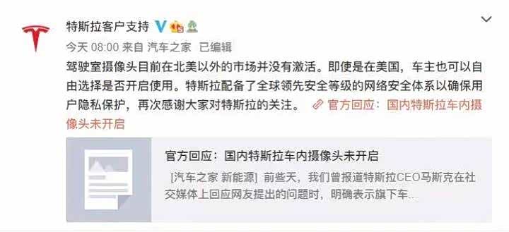 针对“特斯拉车内安装高清摄像头侵犯隐私”一事,昨日(4月7日),@特斯拉客户支持 微博发文回应称:特斯拉驾驶室摄像头目前在北美以外的市场并没有激活。即使是在美国,车主也可以自由选择是否开启使用。