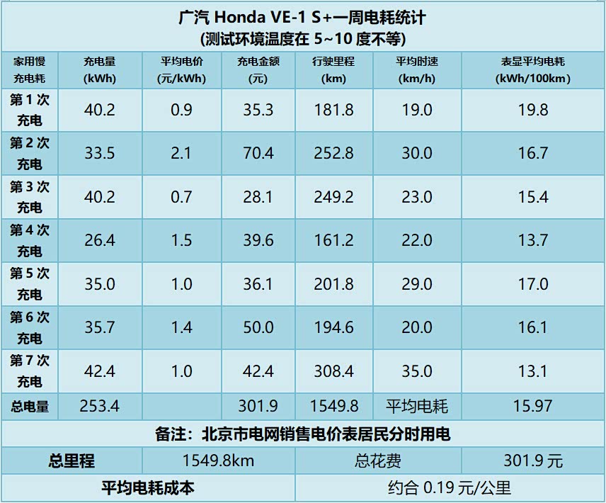 说完了充电问题,我们再聊聊老生常谈的电耗问题,因为这关系着续航里程表现,也是用户是否会出现续航焦虑的关键。实际上,为了尽可能的“正常”表现广汽Honda VE-1 S+的电耗水平,Ken在一周7天的时间里频繁辗转于市区、郊区、商场等生活场景,其目的一方面是为了测试当下充电环境是否友好,也就是使用纯电动车的便利程度;另一方面也是在看广汽Honda VE-1 S+是否真的能够应对各种车主常见的使用条件。在如此“不计成本”的用车环境下,我们得到了如下的电耗统计数据: