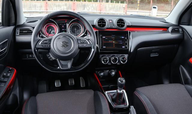 因应性能身份两张前座椅采用包覆性更好的赛车椅造型,肩膀、腰部与大腿都提供侧向支撑,不过泡棉设定偏软,保有一定的舒适性,红色缝线、椅背运动字样视觉加分,但是坐姿略为偏高,影响些许性能风格。后座造型则与标准版Swift完全相同,也缺少红色缝线点缀,近乎平面的椅型设计没有包覆性可言,头部、膝部空间仅只堪用,就是小车等级的后座表现。虽然Swift运动定位在手动钢砲,但日常驾驶该有的驾驶辅助却是相当完备,ACC主动定速、自动刹停、盲点侦测等主流辅助系统都列为标准配置,唯一遗憾便是车道偏移仅有警示而没有方向盘辅助、置中功能。