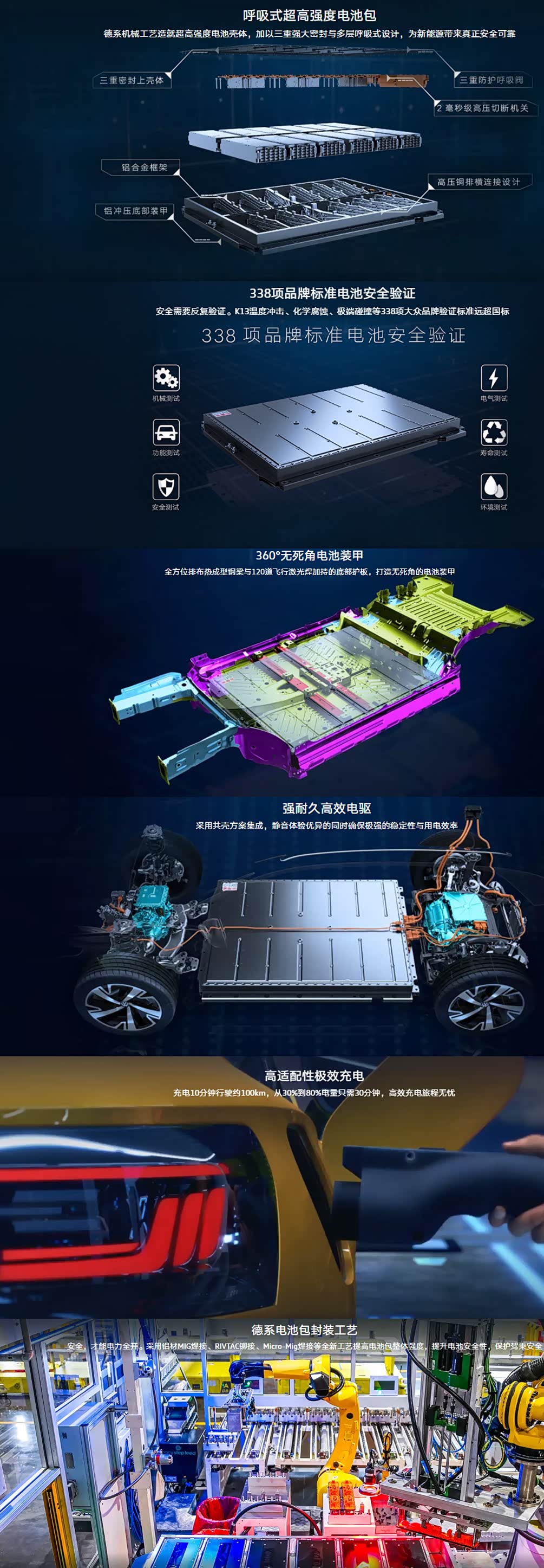 出色的电池包封装工艺,包括铝材MIG焊接、RIVTAC铆接、Micro-Mig焊接等全新工艺,进一步提升电池包整体强度