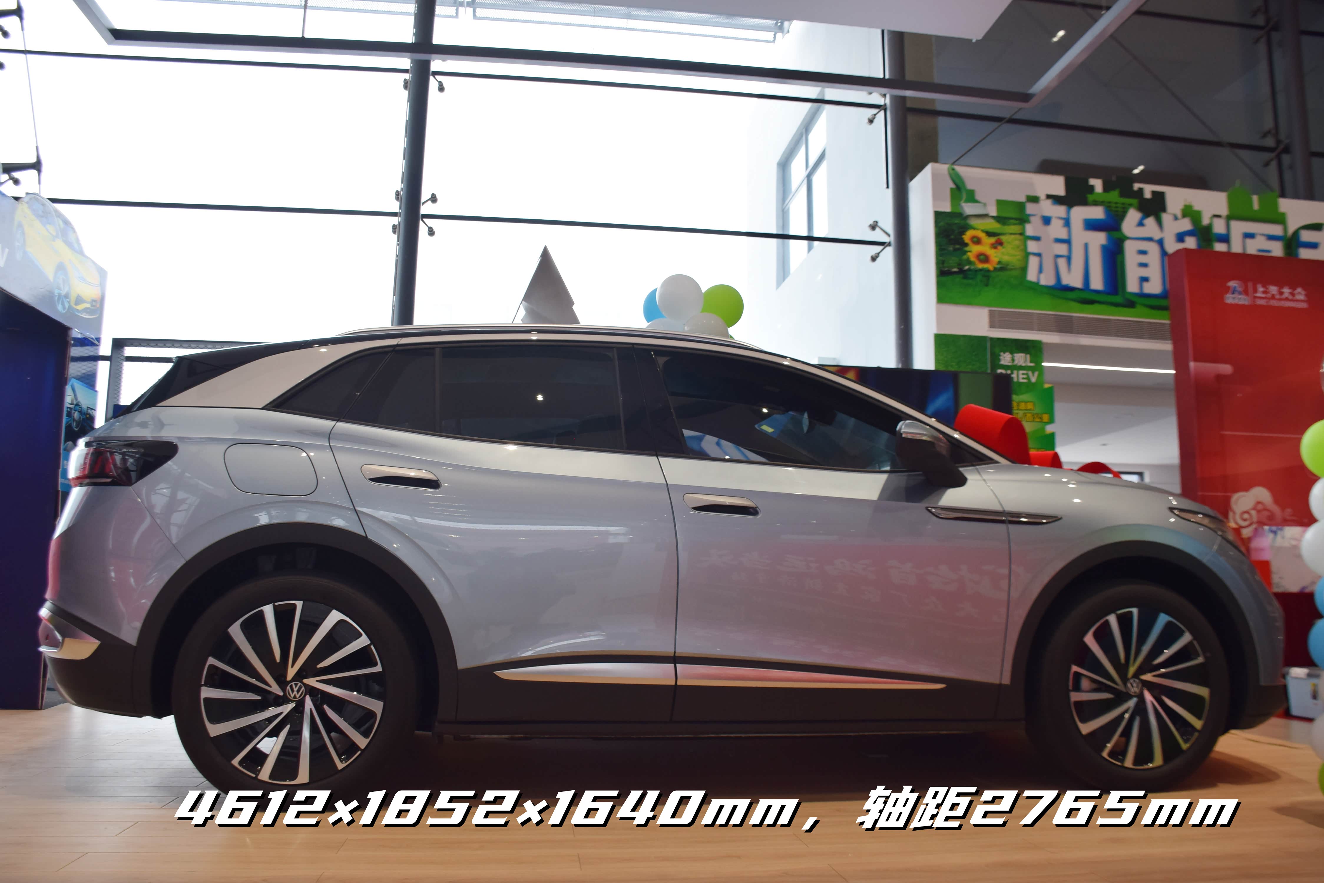 ID.4 X车身尺寸4612×1852×1640mm,轴距2765mm,属于紧凑型SUV,腰线设计很有立体感,从前翼子板一直延续到车尾,配合前后235/50 R20规格的轮胎,营造出十分矫健的车身姿态。实拍的Pro 极智长续航版是后驱车型,整个车系还提供两款四驱车型。