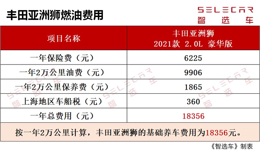 接下来,我们综合一年保险费用、2万公里油费、2万公里保养费、上海地区车船税来计算丰田亚洲狮的一年用车、养车总费用。