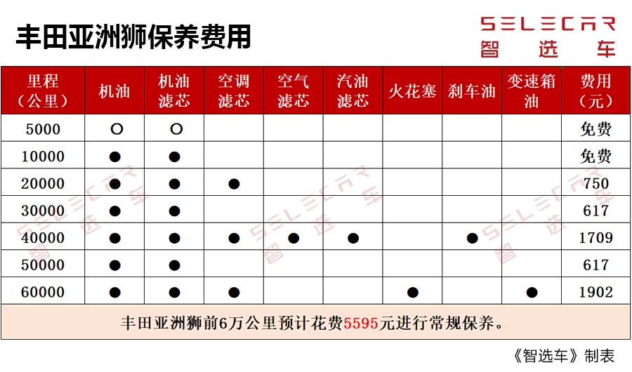 丰田亚洲狮在5000km时可进行一次免费检测,但只检查车况,并不更换机油机滤。在10000km时才是丰田亚洲狮的首次保养,需要更换机油机滤,不过首保同样免费。之后亚洲狮的保养周期为10000km。作为一台日系车,丰田亚洲狮的保养费用还是较为亲民的,更换机油机滤的小保养费用仅为617元;在60000km时丰田亚洲狮在机油机滤之外还需要更换空调滤芯、火花塞以及变速箱油,因此大保养的费用达到了1902元。最终,丰田亚洲狮前6万公里预计花费5595元进行常规保养,平均一年2万公里的费用是1865元。