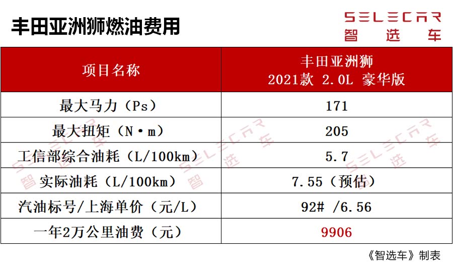 丰田亚洲狮刚刚上市,因此还没有车主实际油耗数据,小智便选取了亚洲龙2.0L车型作为参考。亚洲龙2.0L车型的车主实际油耗为7.68L/100km,推算预估整备质量更轻的亚洲狮实际油耗约为7.55L/100km。按照一年2万公里的标准来计算,丰田亚洲狮每年的燃油费用大概需要花费9906元。