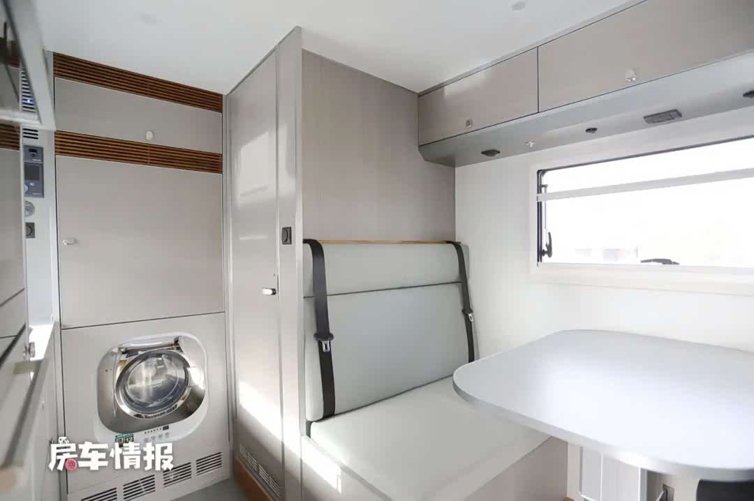 这款房车的箱体与底盘大梁采用的是三点式扭力平衡机构柔性连接方式,箱体为断桥隔热结构,墙体为三明治结构,外蒙皮德国品牌超高强度玻璃钢板材,内层为德国品牌玻璃钢内饰板材,厚度达45mm。另外全车的窗户,包括天窗在内,均使用的是双层隔热玻璃,并带有遮阳帘和防蚊网。