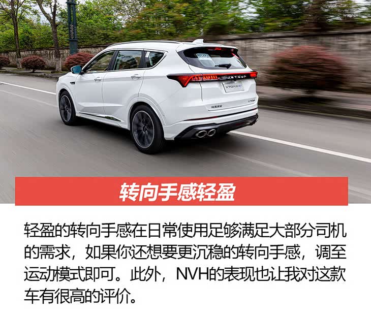 不得不说,这套悬架系统的调校非常符合年轻人的驾驶需求,整体避震器阻尼感很有韧性,相比于同级别其他竞争对手的悬架系统而言,路面上的一些细碎颠簸都可以完全地传递到驾驶员身上,开着很有性能车的底盘质感,同时高速过弯时的侧向支撑也比较到位,总的来说这样的悬挂标定在自主品牌家用车中是不多见的。