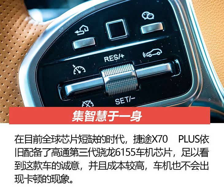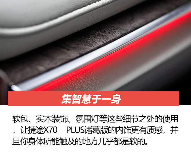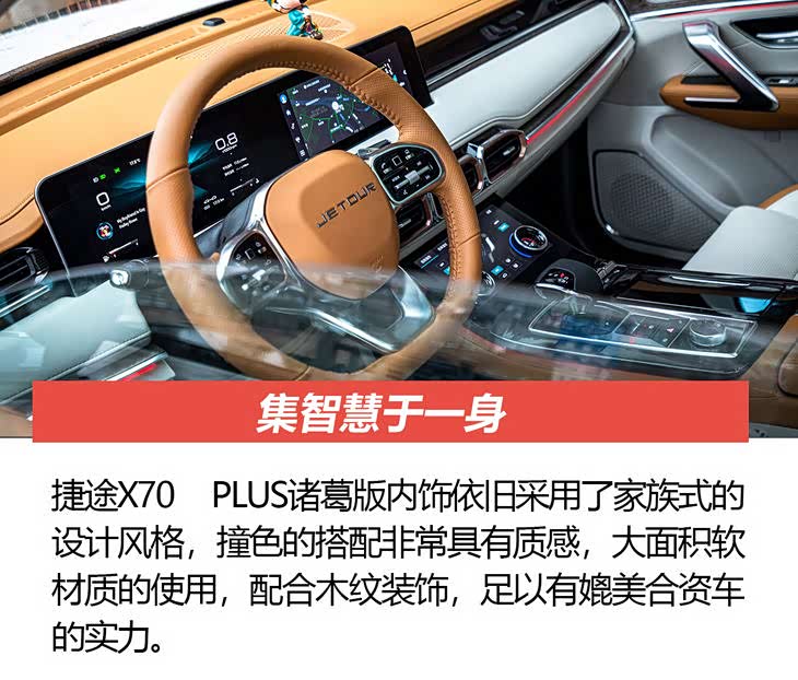 方向盘上设有拇指触控技术以及车载微信按钮,方便操作的同时将整体的调性也提升了一个新的高度。电子挡杆、多边形空调出风口以及车内氛围灯,都让捷途X70 PLUS诸葛版有了可以和合资品牌叫板的实力。