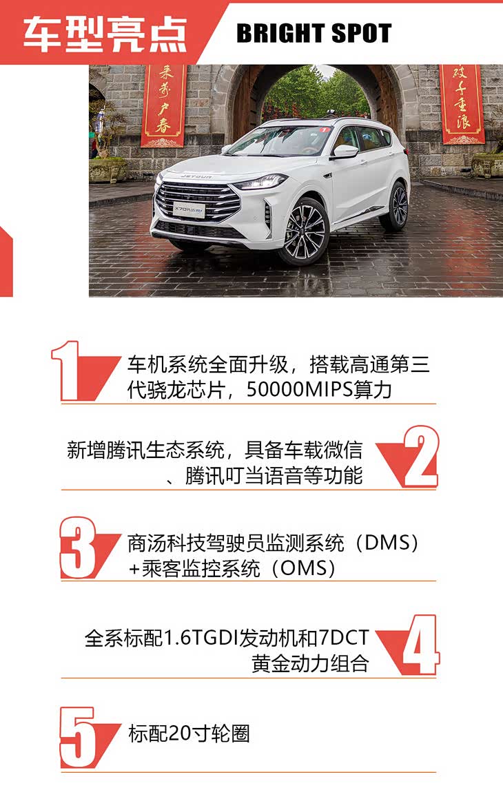 高通第三代骁龙6155车机芯片的使用,车机内部的所有应用程序都可以完美兼容,并且没有任何的卡顿现象,这才是一个车机系统是否流畅、好用的关键所在。在目前全球芯片短缺的情况下,捷途在这个关键的时期还能对芯片进行更新迭代,这其中的成本足以看出,一家自主品牌想要脱颖而出的决心。