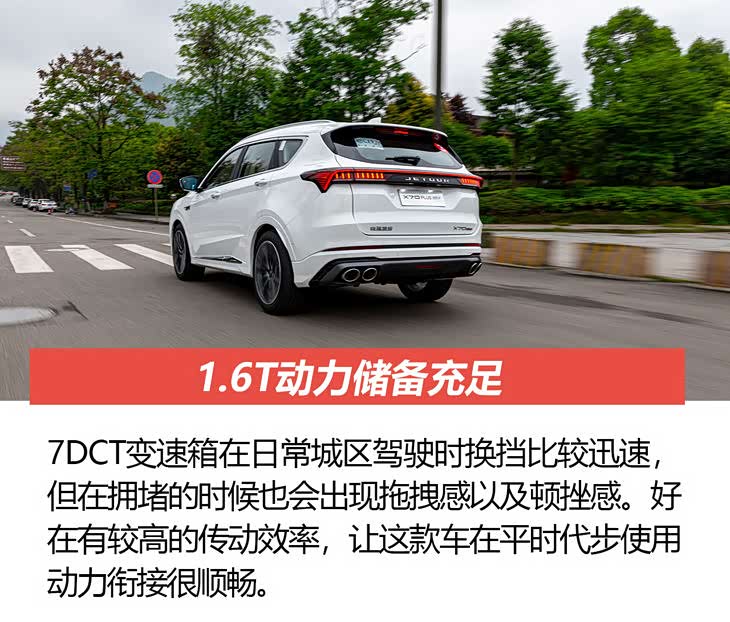 这台7速双离合变速箱拥有比较不错的传动效率,但因为双离合本身的结构问题,低速顿挫、有明显的拖拽感都是无法避免,好在捷途X70 PLUS这款车的标定比较到位,将这种情况降低到最低。在不堵车和高速行驶时,也有着较低的转速区间,保证燃油经济性。