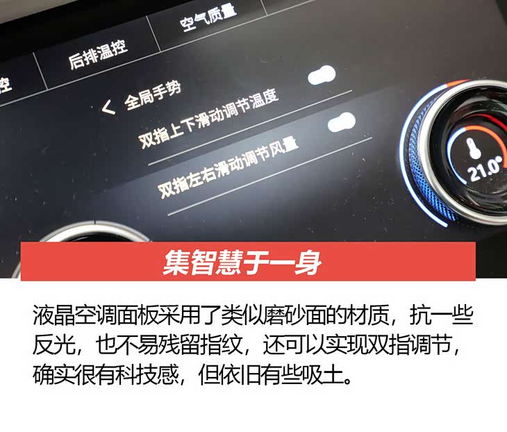 捷途X70 PLUS诸葛版的重点说完,接下来我们就来看看这款车的内饰精华。首先撞色的设计是我最喜欢的一点,这样的设计直接将内饰的豪华氛围提升了不止一个层级。最让我感到意外的就是空调面板采用了液晶屏+实体旋钮的操作界面,重要的是这款屏幕进行了表面防滑处理,类似磨砂的材质不仅可以不容易指纹残留,看着也非常高档。