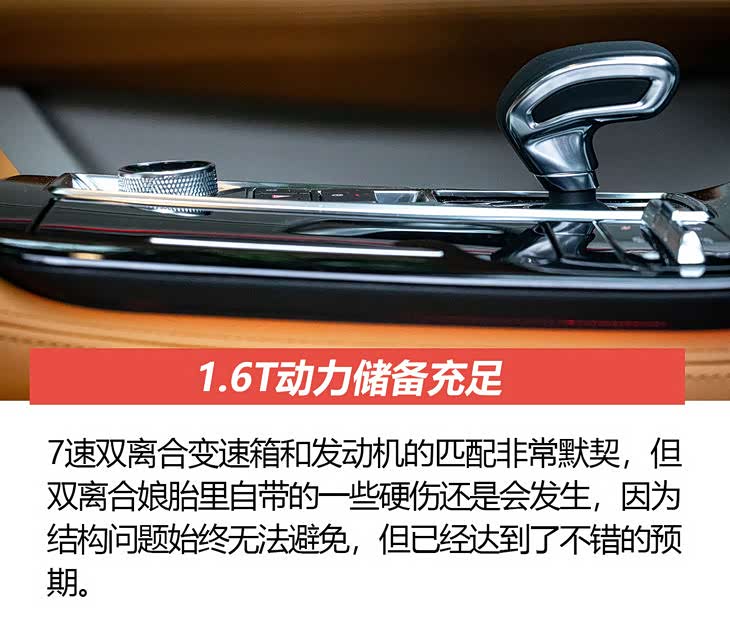 动力部分可以说是大家非常熟悉的“老朋友了”,1.6T发动机和7速双离合变速箱的搭配已经使用很久,这套成熟的动力系统足以满足你任何状态下的动力请求。1.6T发动机最大功率145kW,峰值扭矩290N·m,在中后段的爆发依旧非常迅猛,动力请求可谓随叫随到,整体的动力储备可以和2.0T发动机媲美了。