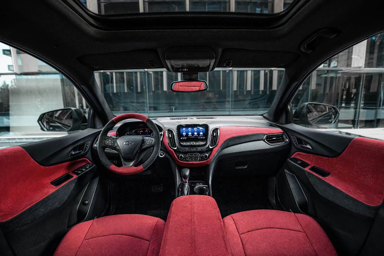 仪表台、侧门板、座椅、中央扶手和挡位包覆炫红缝线