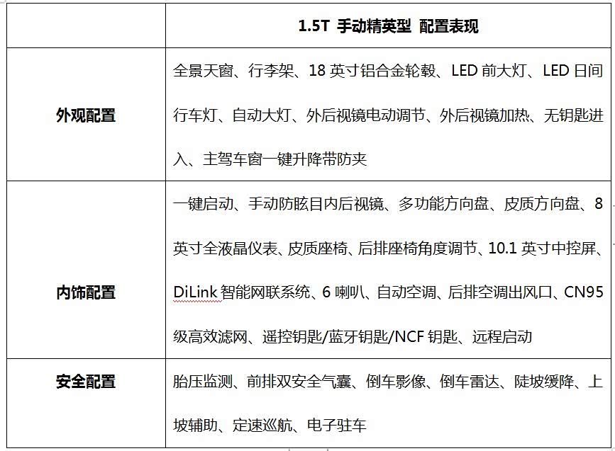 1.5T手动精英型虽然是入门版车型,但配置表现已经足够的丰富,能够带来非常好的用车体验,比如全景天窗、LED自动大灯、皮质方向盘、皮质座椅、自动空调、8英寸全液晶仪表、10.1英寸中控屏等等实用的配置都有搭载,尤其是DiLink智能网联系统全系标配,拥有在线导航、车联网、智能语音交互、OTA远程升级、远程控制车辆等功能,便利性和娱乐性都很高,非常适合预算不多且不介意手动挡的消费者。