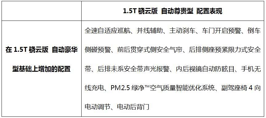 1.5T骁云版 自动尊贵型是顶配版车型,它比1.5T骁云版 自动豪华型多了主动刹车、并线辅助、全速自适应巡航、侧安全气帘等安全配置,此外还有副驾座椅4向电动调节、电动后背门、手机无线充电等功能,如果你是注重安全性的话,多花这1万元还是值得的。但个人觉得这些增加的配置并非刚需,所以这个顶配版除非你预算充足,否则不是很推荐购买。