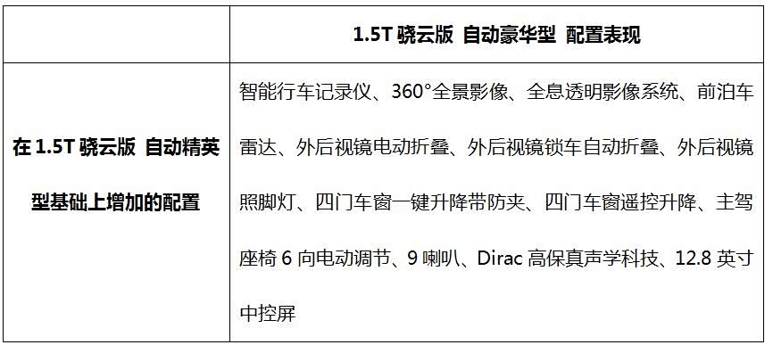 1.5T骁云版 自动豪华型比1.5T骁云版 自动精英贵了1万元,配置上增加了主驾座椅6向电动调节、行车记录仪、前雷达、全景影像、全息透明影像系统等提升便利性和安全性的配置,同时中控屏的尺寸也升级到了12.8英寸,音响系统也得了升级,整体的档次感上有明显提升,所以这1万元还是物有所值的,1.5T骁云版 自动豪华型也是整个车系中最为推荐选择的车型。