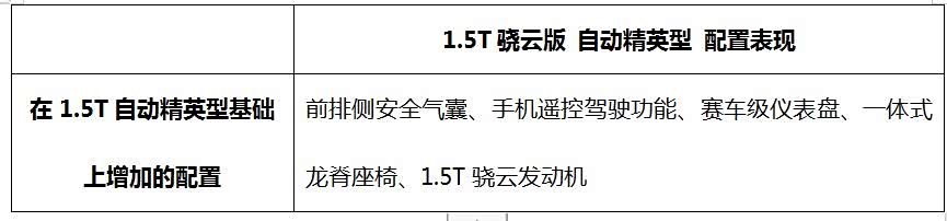 1.5T骁云版自动精英型比1.5T自动精英型贵了8000元,配置方面除了换装动力和燃油经济性更好的1.5T骁云发动机外,还增加了前排侧安全气囊、手机遥控驾驶功能、一体式龙脊座椅等配置,同时8英寸的全液晶仪表也更换成赛车级仪表,如果你想要更好的动力以及更具档次感的内饰,这8000元花得还是挺划算的。