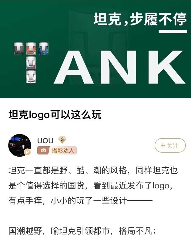 据介绍,坦克(TANK)品牌来源于刚猛、强悍的“陆战之王”。这也是坦克品牌希望向用户展示的价值。坦克作为军事武器,十分贴合大众对于“铁汉”这一形象标签的想象。设计师借助极简化设计,采用金属材质勾勒出一辆具有未来科技气息的陆地之王,TANK首字母呼应的“T”字型雄壮炮台与炮筒组合,凶悍气息迎面而来,“铁汉”形象呼之欲出。坦克品牌LOGO在以坦克为图腾的基础上,选择了俯视的视觉角度。从高处俯视坦克,T型的坦克炮管与U型坦克机身。