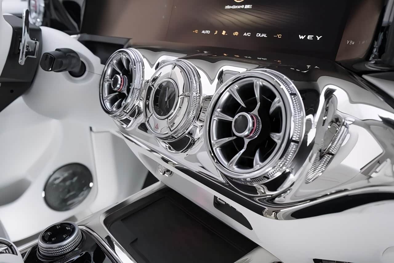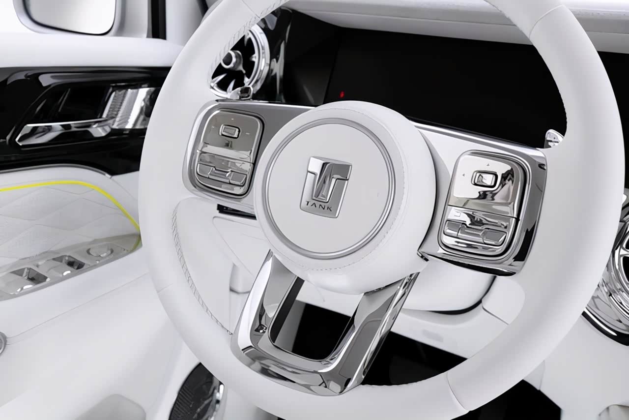 而在内饰方面,赛博坦克300很大程度上保留了坦克300的设计和布局,不过值得注意的是,赛博坦克300方向盘中央采用了坦克全新品牌Logo,配合白色的内饰配色,整体的质感营造的还是很不错的,并且赛博坦克300依旧保留了双联屏、电子档杆以及涡轮状空调出风口等设计,只不过在这些区域都有着银色金属和镀铬装饰做以点缀。