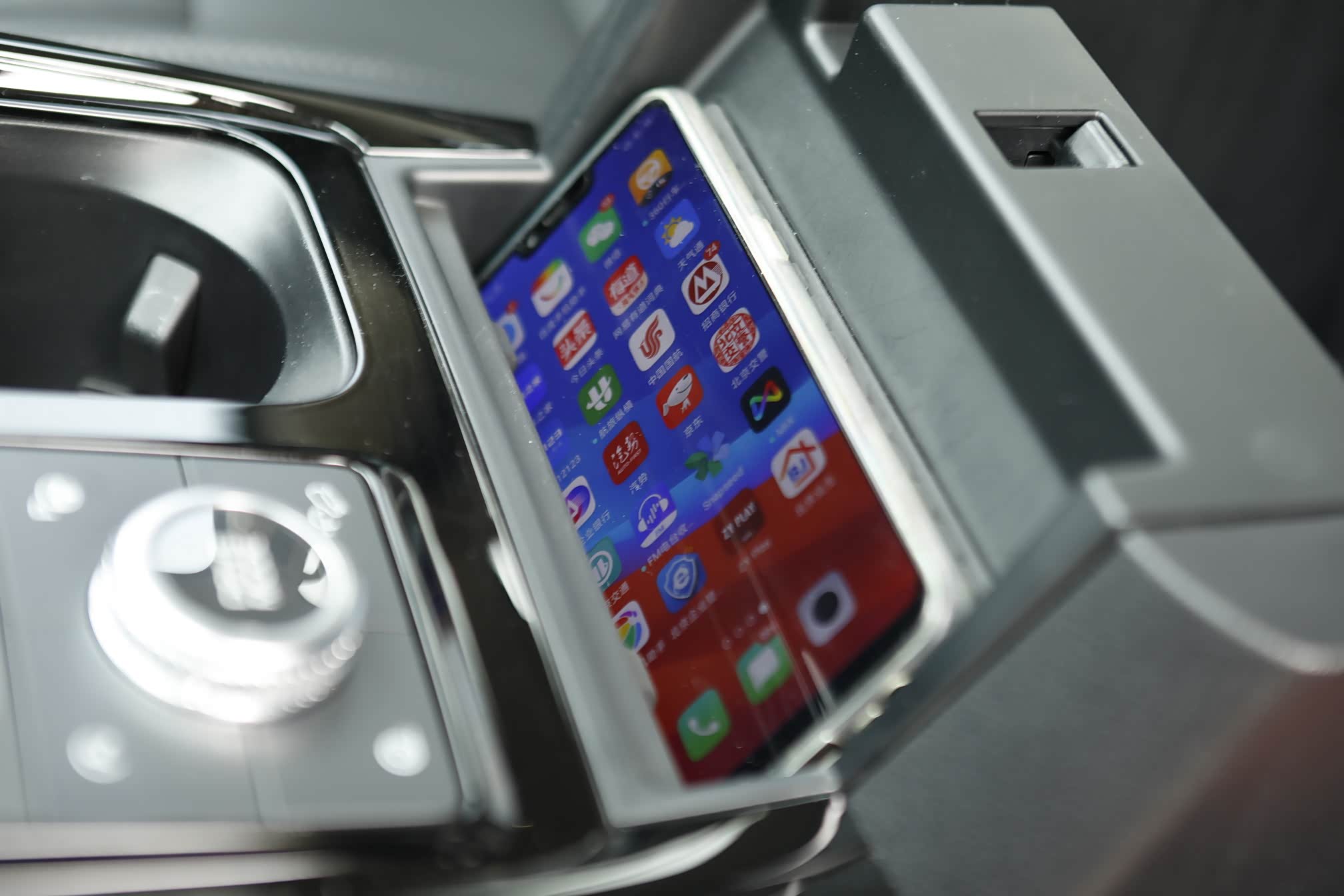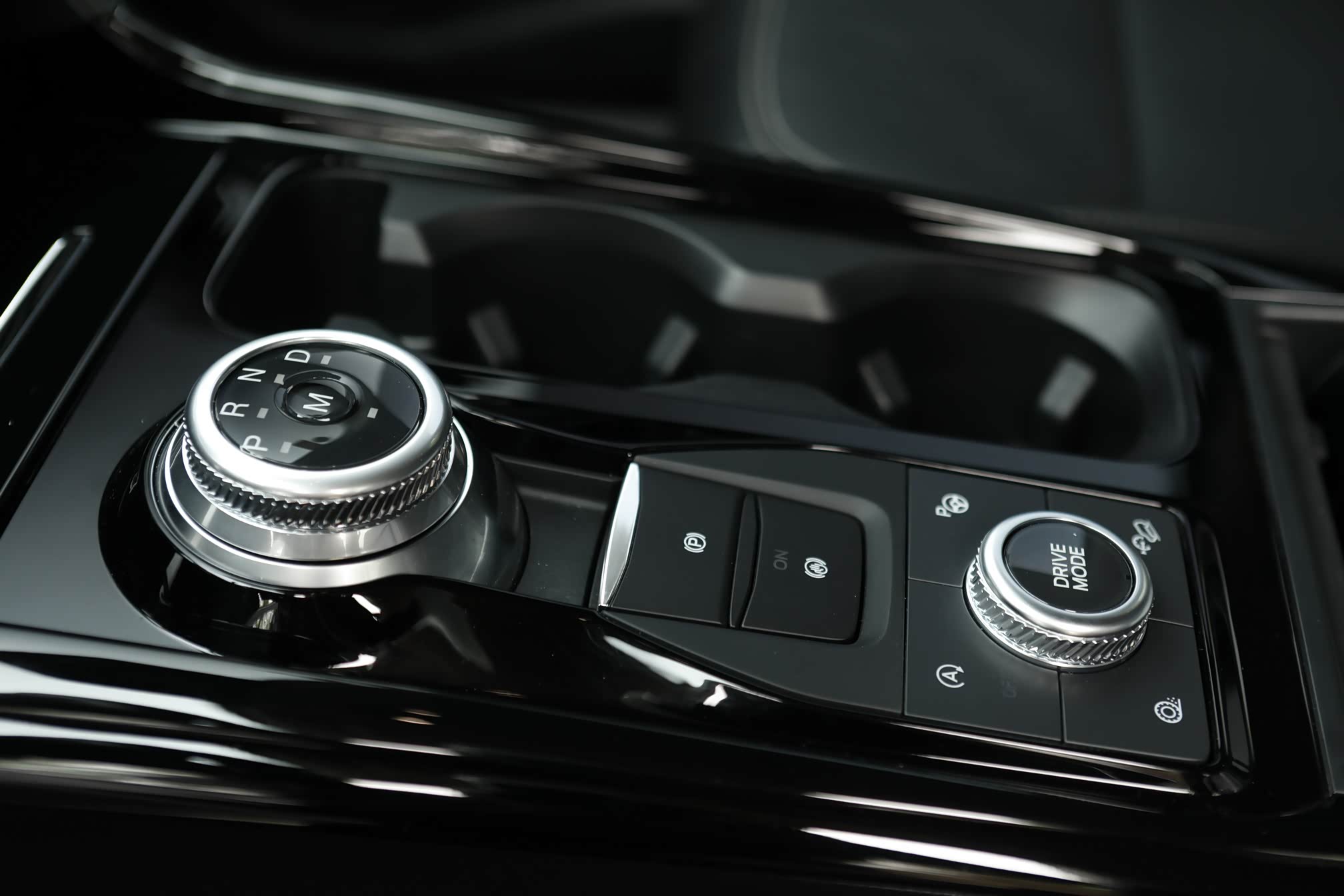 中央通道的布局也是相当紧凑,各个功能的排列井然有序。换挡模式和驾驶模式转换都是旋钮式的,旁边是两个带氛围灯的杯架,前方的卡槽可以摆放手机,后面可以手机无线充电。