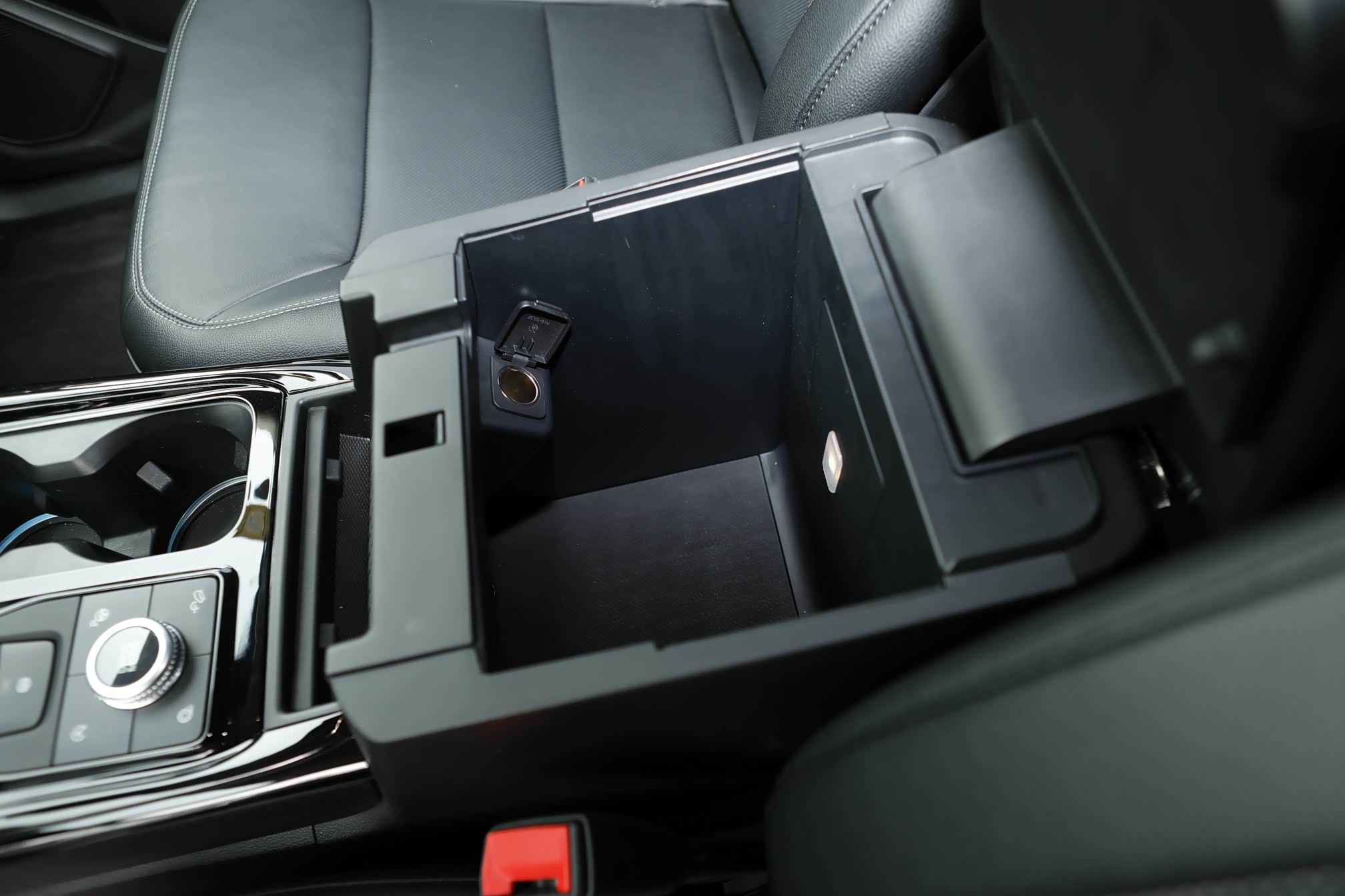中央扶手箱开口很大,空间也够深,上方设有一层储物板。内部设有12V电源和照明灯,较大的容积能够储存不少物品。