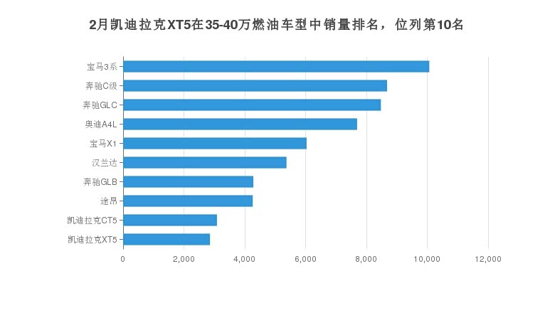 在2021年2月的同价位车型销量排名中,凯迪拉克XT5销量位列第11名,与第1名宝马3系的销量差距为7209辆。